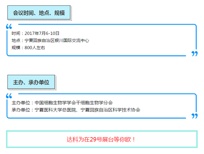 中國細胞生物學學會干細胞生物學分會主辦,寧夏醫科大學總醫院和寧夏科學技術協會共同承辦的“中國干細胞第七屆年會”,將于2017年7月6日至10日在寧夏回族自治區銀川國際交流中心召開。本屆年會主題為:干細胞研究與轉化——破冰之旅達科為也在本次會議中積極響應,達科為&PeproTech攜手合作,恭祝中國干細胞第七屆年會取得成功!