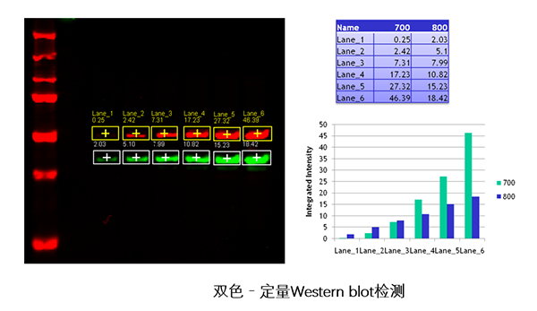 Odyssey 近紅外熒光成像系統(tǒng)采用兩種不同的近紅外雙色熒光染料同時(shí)檢測,例如:可用兩種不同近紅外熒光染料標(biāo)記的抗體分別與兩種蛋白反應(yīng)從而達(dá)到在同一張膜上檢測兩種不同的蛋白的目的。