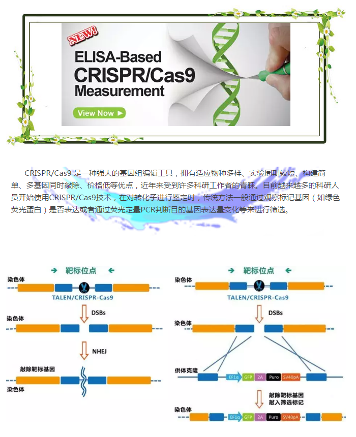 傳統方法操作復雜、花費大量時間與精力,針對這個特點,Epigentek研發出了通過ELISA檢測Cas9蛋白含量,進而篩選轉化子的檢測試劑盒。該試劑盒僅需要純化的Cas9 核酸酶和全細胞提取物(分離自各物種的組織和培養的細胞),就能夠特異性定量檢測CRISPR相關蛋白9(Cas9,dCas9)。