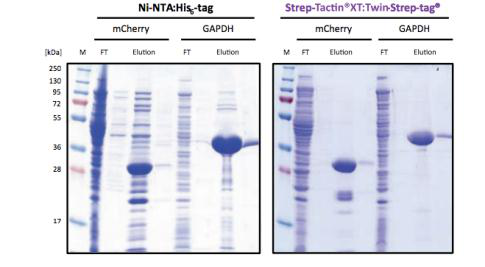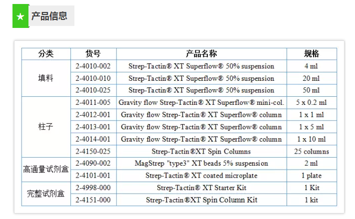 Strep-tag?是IBA life sciences基于生物素(Biotin)和鏈霉親和素(Streptavidin)之間的結(jié)合反應(yīng)開發(fā)的蛋白純化系統(tǒng)。第三代Strep-tag?系統(tǒng):「Strep-Tactin?XT:Twin-Strep-tag?」蛋白純化系統(tǒng),其結(jié)合力可達(dá)pM級別但仍保持結(jié)合的可逆性和固定化蛋白的溫和復(fù)蘇能力。因此,用Strep-Tactin?XT 系統(tǒng)能有效提高您目標(biāo)蛋白的純度,解決您實驗中所遇到的常見問題。