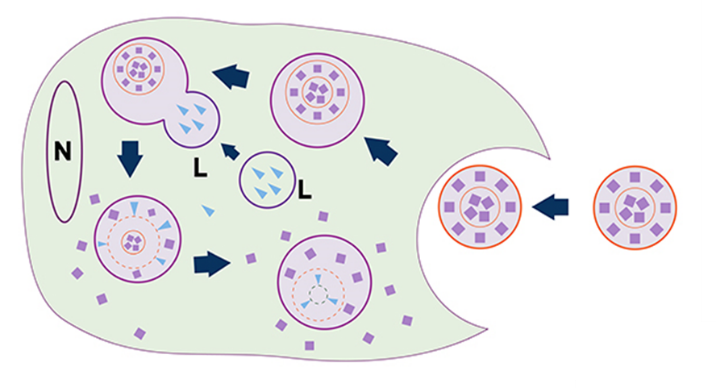 圖. Clophosome?巨噬細胞耗竭的原理。包裹著氯磷酸的脂質體Clophosome?借助巨噬細胞的內吞作用進入細胞,與溶酶體融合后,在磷酸酶的作用下,釋放出氯磷酸,當細胞內的氯磷酸濃度達到一定閾值,就會對巨噬細胞造成不可逆轉的損害,從而迫使其進入細胞凋亡程序。