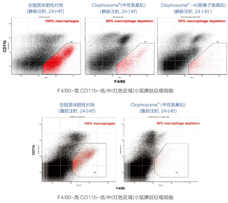 并且,在單次靜脈注射或腹腔注射0.2 ml Clophosome?(中性氯弗松)后自24小時起脾臟和肝臟中巨噬細胞耗竭可持續一周保持在80%以上,如果每4天注射一次,高效巨噬細胞耗竭可維持數周之久。此外,Clophosome?-A(陰離子氯弗松),除保持了Clophosome?(中性氯弗松)所有優點之外,更使得單次注射后巨噬細胞的耗竭率高達90%以上。