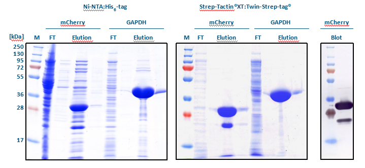 以SDS-PAGE分析發現,不管是mCherry或是GAPDH,使用Strep-tactin? XT: Twin-Strep-tag?都能得到純度較高的目標蛋白(見Elution)。Western Blot分析結果顯示,提取mCherry所出現的雜質為其降解產物。