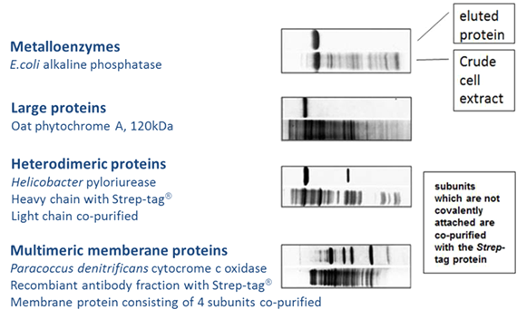 因His-tag系統使用Ni離子,所以在純化金屬蛋白(多數為酶)時,可能會受到金屬間交互作用的干擾。而使用Strep-tag? 則不會出現此問題,因為Strep-Tactin? XT與Strep-tag?的特異性結合不受金屬離子影響。且因其溫和的純化流程,所以還能用于純化大型蛋白、多亞基的蛋白復合體或是跨膜蛋白,并且保持蛋白功能。以Strep-tag?系統純化出不同的蛋白實例如下: