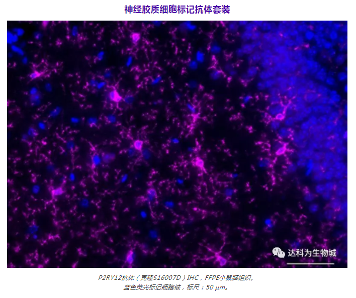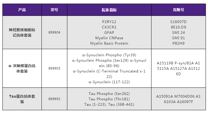 神經(jīng)膠質(zhì)細(xì)胞抗體套裝中包含檢測常見神經(jīng)膠質(zhì)細(xì)胞的標(biāo)記物,如趨化因子受體1抗體(CX3CR1)、膠質(zhì)纖維酸性蛋白(GFAP)、髓磷脂(Myelin)和嘌呤能受體(P2RY12)。其中的輔助試劑可以檢測各種屬磷酸化或總α-突觸核蛋白/Tau,這些聚集物與阿爾茨海默癥和帕金森皆有重大關(guān)聯(lián)。