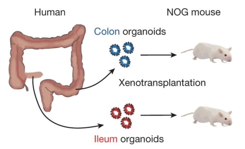 將人類回腸或結腸類器官移植到免疫缺陷(NOG)小鼠結腸