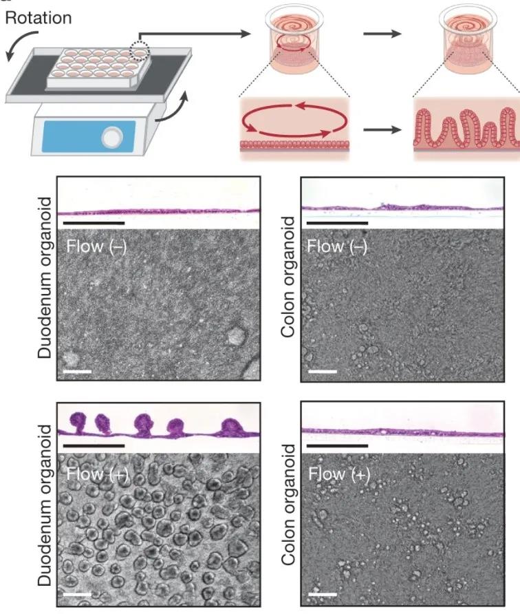 下圖為存在(+)或不存在(-)流動的培養基的情況下培養四天的2D十二指腸和結腸類器官的鏡下圖片。(蘇木精和曙紅染色)