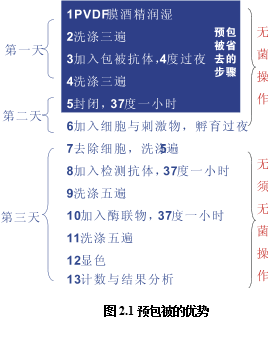 如圖2.1所示,預包被有著明顯的技術優勢。PVDF板的ELISPOT試驗一共需要3天時間,采用預包被板可以節省一天的時間,當天處理細胞,當天上板檢測;未包被的檢測共有13步,預包被可以省掉其中的5步,并且這5部都是需要無菌操作的步驟,占整個無菌操作步驟的5/6。節省時間只是其一,由于減少了無菌操作的步驟,使得整個實驗污染與出錯的概率大大降低,提高了整體試驗的成功率。