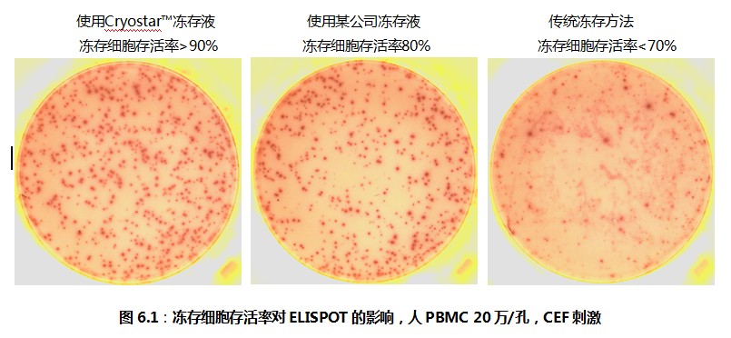 考慮到ELISPOT檢測的特殊性,荷蘭U-CyTech公司經過精心的研究與反復的驗證,推出了Cryostar?凍存試劑盒,在凍存液中添加了一系列對細胞有特殊保護作用的保護劑。達科為公司在接到Cryostar?凍存試劑盒之后,在我們的實驗室以及國內數家客戶的實驗室做了細胞凍存與復蘇的實驗,并且對復蘇之后的細胞做了ELISPOT檢測。結果表明,淋巴細胞的存活率超過90%,ELISPOT斑點形成頻率與新鮮細胞完全相同。參見圖6.1。