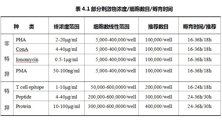 不論是普通多肽(比如重疊多肽庫(kù))還是蛋白質(zhì)或者蛋白類的組織提取物,這些刺激物都需要APC的攝取、內(nèi)化、加工、呈遞,之后T細(xì)胞才能被刺激。所以,使用這些刺激物的時(shí)候,一定要保證足夠的細(xì)胞密度。根據(jù)我們的經(jīng)驗(yàn),細(xì)胞密度要至少達(dá)到20萬(wàn)-30萬(wàn)每孔。多肽推薦的細(xì)胞密度為30萬(wàn)/孔,蛋白推薦的細(xì)胞密度為40萬(wàn)/孔。也可以根據(jù)實(shí)際情況,在線性范圍內(nèi)調(diào)整,參見(jiàn)表4.1與圖4.2。