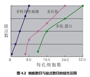 非特異性的刺激物可以直接刺激淋巴細(xì)胞,這種刺激不依賴于APC或者其它輔助細(xì)胞,是單細(xì)胞反應(yīng)行為。所以它對(duì)細(xì)胞密度沒(méi)有要求,在極寬的細(xì)胞濃度范圍之內(nèi)——多至40萬(wàn)/孔,低至5千/孔——斑點(diǎn)數(shù)量和細(xì)胞數(shù)量都有簡(jiǎn)單的正比例關(guān)系,參見(jiàn)圖4.2。但是考慮到,只有恰當(dāng)?shù)陌唿c(diǎn)數(shù)目才便于數(shù)據(jù)統(tǒng)計(jì),所以推薦細(xì)胞密度為10萬(wàn)/孔。如果細(xì)胞數(shù)目過(guò)多,滿孔都會(huì)被斑點(diǎn)覆蓋,并且相互重疊。