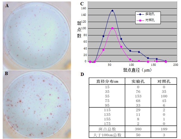 由于有了充足的信息與理由,我們可以在最后斑點計數的時候,把斑點直徑的閾值設定為100μm:我們只計數大于100μm的斑點,小于100μm的斑點不予計數。這樣負對照孔與實驗孔的最終結果為3:50,相差有17倍!這比最初相差一倍的結果顯著得多。
