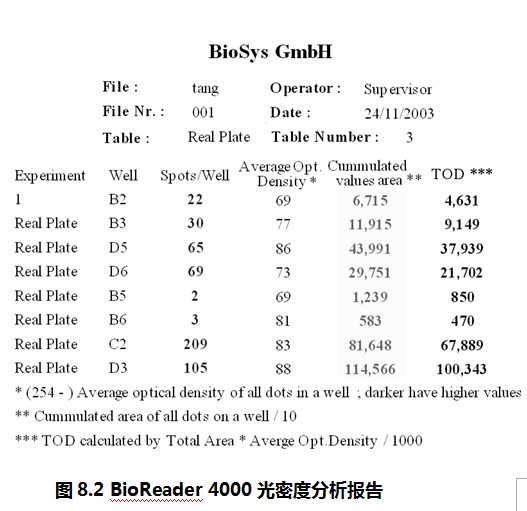 如圖8.2所示,這是BioReader 4000光密度分析報告。它可以提供的信息有:孔的位置、每孔的斑點數目、該孔斑點的平均光密度(Average Opt. Density)、該孔斑點的總面積(Cumulated values area)、該孔相對細胞因子分泌總量(TOD,即光密度總值)。