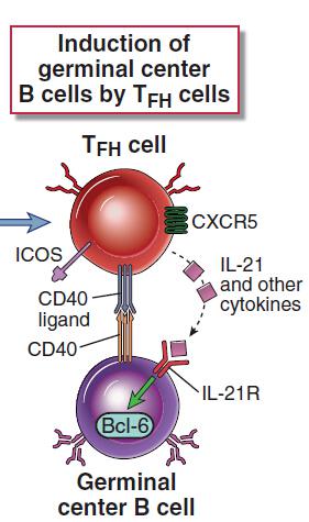 ICOS: Tfh 細胞上的 ICOS 與 B 細胞上的 ICOS-Ligand 作用,傳遞協同刺激信號,對 Tfh 細胞的產生及存活、 IL-21 的表達、發生中心的形成及特異性抗體的產生都至關重要。