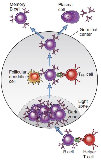 Tfh 細胞的主要作用是增加高親和力 B 細胞和長壽漿細胞的形成,并幫助他們轉移到發生中心(GC)。在接受抗原刺激后,初始 B 細胞首次移動到 T 細胞區,且在來自 Tfh 細胞和抗原呈遞細胞的共刺激作用下開始活化并形成發生中心。當發生中心的 B 細胞開始分化為漿細胞或記憶 B 細胞時, Bcl-6 會阻止 B 細胞的增殖,因為 Bcl-6 可以抑制 B 細胞活化基因的表達,如 CD69、 STAT1 和 CD80 等,同時也會通過調節 Prdm1 來抑制發生中心的 B 細胞向漿細胞分化。 Tfh 細胞通過 CD40 的作用致使 Bcl-6 轉錄沉默,從而促使發生中心 B 細胞存活和增殖。且在這一過程中,CD40L、PD-1、BAFF、IL-4 和 IL-21 等信號分子的參與也是必不可缺的。