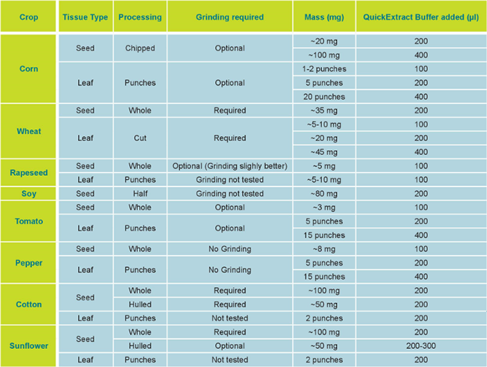 △圖1. 不同作物種子或葉片樣品預處理、研磨需求、起始重量及快提液所需量