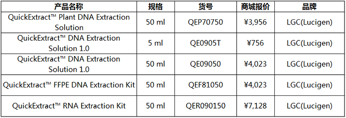 QuickExtract? Plant DNA Extraction Solution已成功地用于從擬南芥,玉米,胡椒,大豆,斯佩耳特小麥和菠菜葉中提取DNA。 提取液體積為50 mL,足以進行500次(100μL/次)提取。