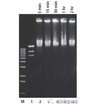 pUC 19 DNA用Pvu II消化,然后按標準連接反應使用2U Fast-Link? ligase進行連接(泳道1-6). 泳道 M,1-kb ladder;泳道1,無酶對照;泳道2-6, 分別為5 min, 15 min, 30 min, 45min, 1 hr連接結果。
