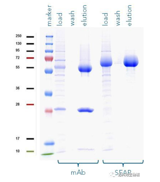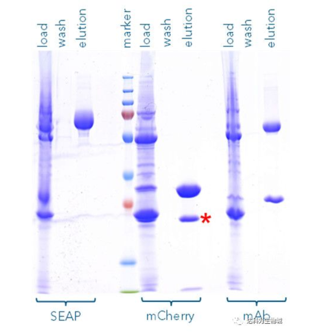 此外,我們也測試了其他的蛋白,例如SEAP(72 kDa)或抗體(mAb,其重鏈為55kDa)。圖B為以Strep-Tactin?XT純化SEAP-TST、mCherry-TST與mAb-TST的SDS-PAGE分析結果,可見對于不同蛋白,Strep-tag?系統都能純化出高純度的目標蛋白。(注:紅色標記處為 mCherry的降解產物,非雜帶)