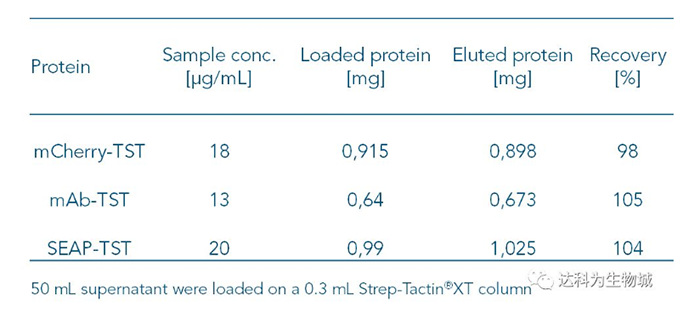 因Strep-Tactin?XT與Twin-Strep-tag蛋白的高親和力,即使目標蛋白的濃度低,使用Strep-Tactin?XT仍可以有效的捕捉上清中的目標蛋白。表C整理了幾個實驗的數據,顯示當目標蛋白濃度低于20μg/ml時,得率仍能達到幾近100%。