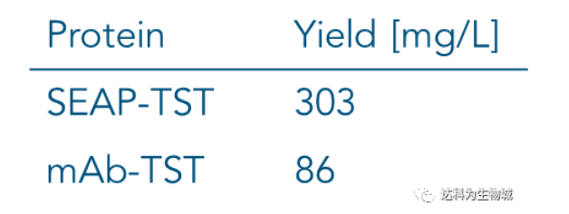 除了上述實驗所用的CHO細胞株外(中國倉鼠卵巢細胞),另一常用于生產蛋白的哺乳動物細胞株為HEK293(人胚胎腎細胞),使用上較CHO簡單。我們測試了Strep-Tactin?XT的純化表現:表D1為以Expi293表達SEAP-TST或mAb-TST蛋白后,目標蛋白的濃度。圖D2為純化表現的SDS-PAGE分析。從中可知,與ExpiCHO培養基相同,直接將表達好的Expi293上清加入1ml Strep-Tactin?XT高載量重力柱中進行純化,一樣能夠快速的得到高純度的目標蛋白。